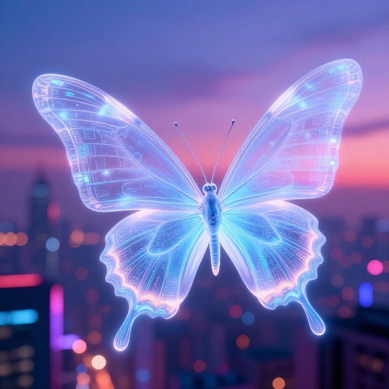 Butterfly.ai as a futuristic AI assistant shaped like a glowing butterfly with translucent digital wings fluttering over a neon cityscape at dusk, vibrant colors, cyberpunk style, detailed tech patterns on wings, ethereal lighting