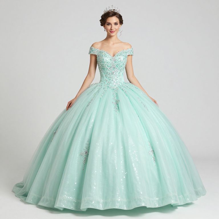 Photograph of a young woman standing against a plain white background, wearing an off-the-shoulder, light turquoise ball gown with a full, voluminous skirt. The dress is adorned with intricate sparkling embellishments across the bodice and waist, adding a touch of elegance. Her dark hair is styled in an updo, and she wears a small, delicate tiara. She has a fair complexion and is smiling softly, with her hands resting on her sides. The gown's fabric appears to be a combination of satin and tulle, giving it a luxurious and ethereal quality.