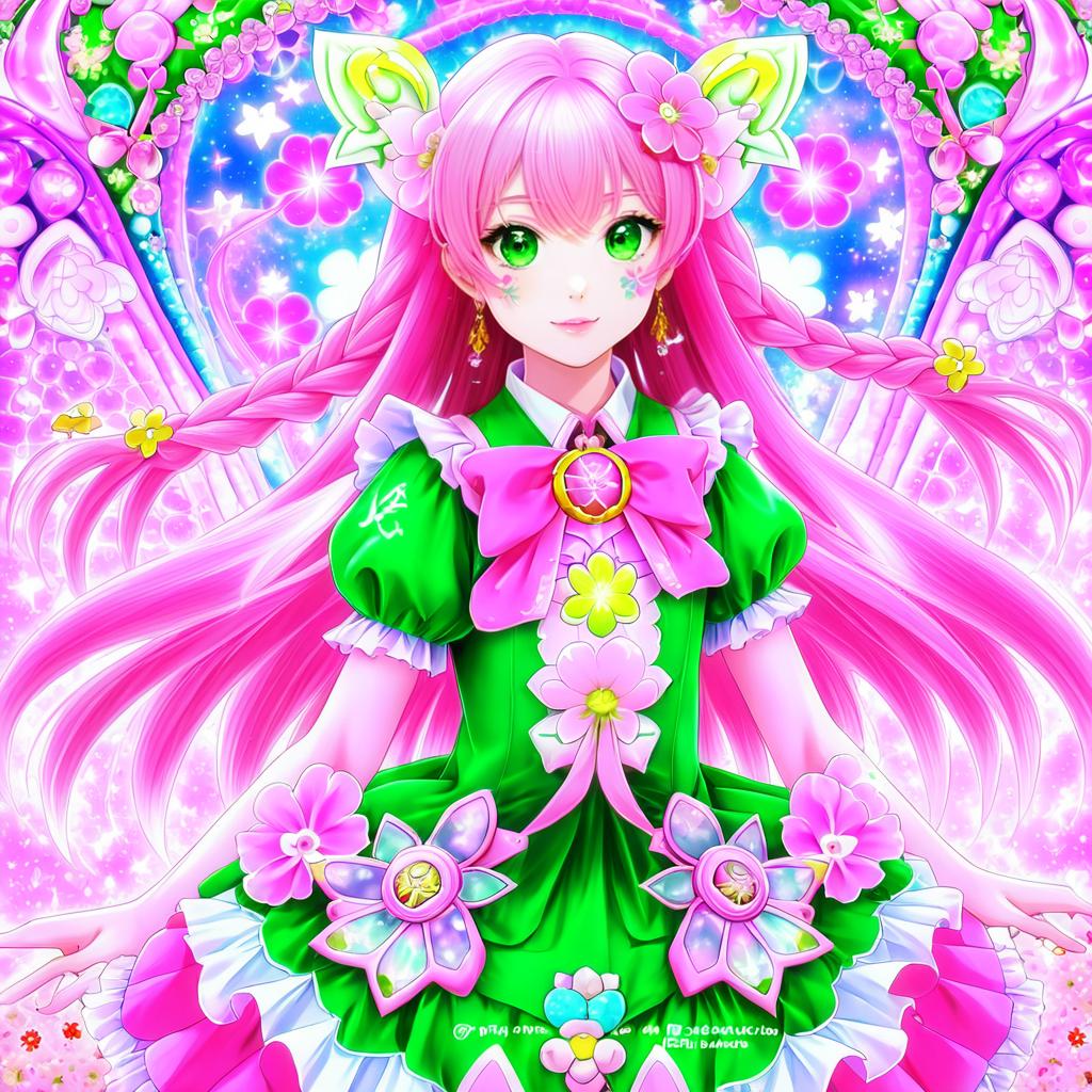 Hanami kotoha, precure, 1girl, green eyes, multicolored eyes, flower in eye, pink hair, long hair, twin braids, hair flower, magical girl, magical girl, by artist hyde (tabakko), anime