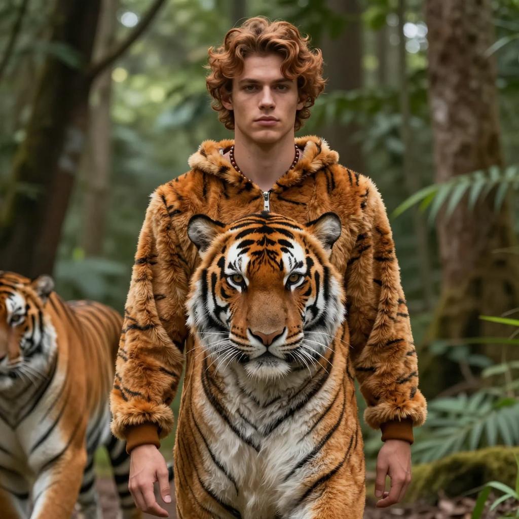 Photorealistic image of a young man with curly blond hair wearing a detailed tiger onesie with a large tiger face on the chest. He stands in a forest with tall trees and filtered sunlight, showing a serious expression and wearing a necklace. Green leaves are visible on his shoulders, complementing the natural setting.