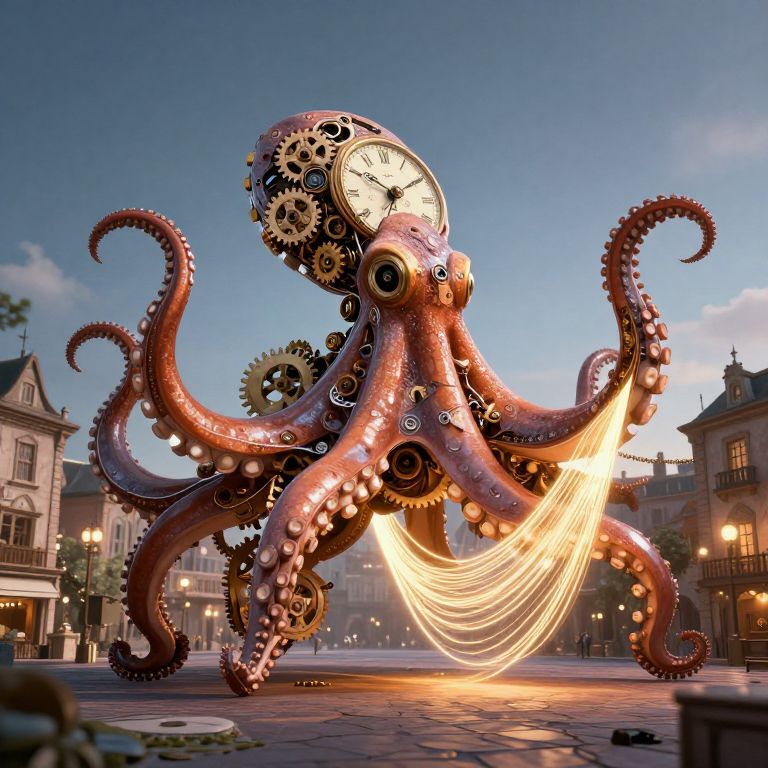 An enormous clockwork octopus, its tentacles made of interlocking cogs, weaves time itself into a luminous tapestry above a silent town square.