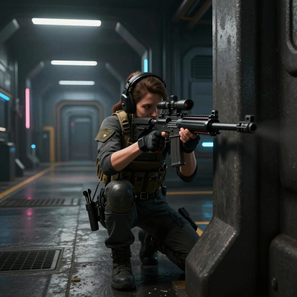 Photorealistic CGI of a female soldier with dark hair, wearing tactical gear, aiming an assault rifle in a dim, neon-lit, futuristic corridor