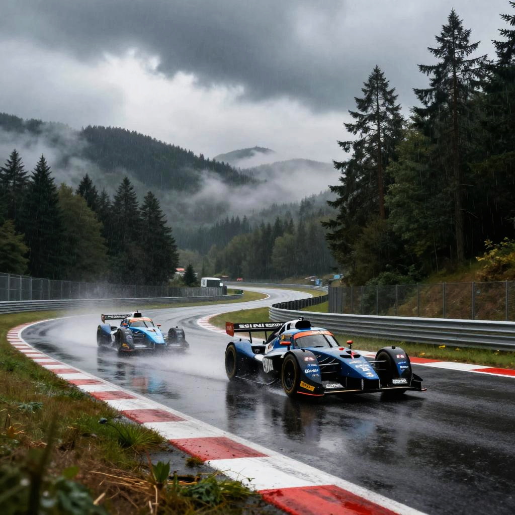 Racetrack background illustrating a rainy day at a mountain race circuit, showing glistening wet tarmac, puddles, rain droplets in the air, racers maneuvering carefully with visible tire spray, surrounded by misty pine forests and dramatic clouds, photorealistic style.