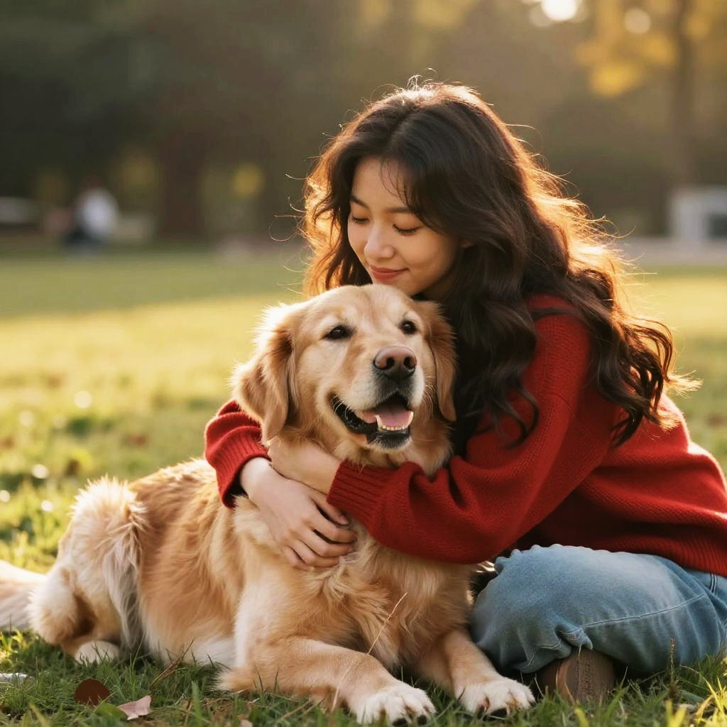 1girl, dog, realistic, long hair, closed eyes, animal, grass, blurry, lying, tongue, on stomach, brown hair, blurry background, long sleeves, outdoors, depth of field, tongue out, photorealistic, lips, solo, shirt, hug, open mouth, smile, red shirt