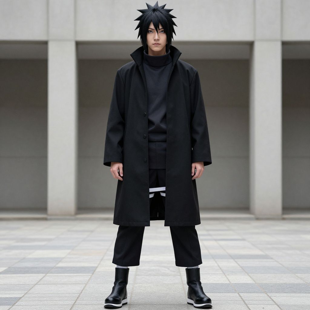 Sasuke Black Outfit, man in black coat standing in front of a building