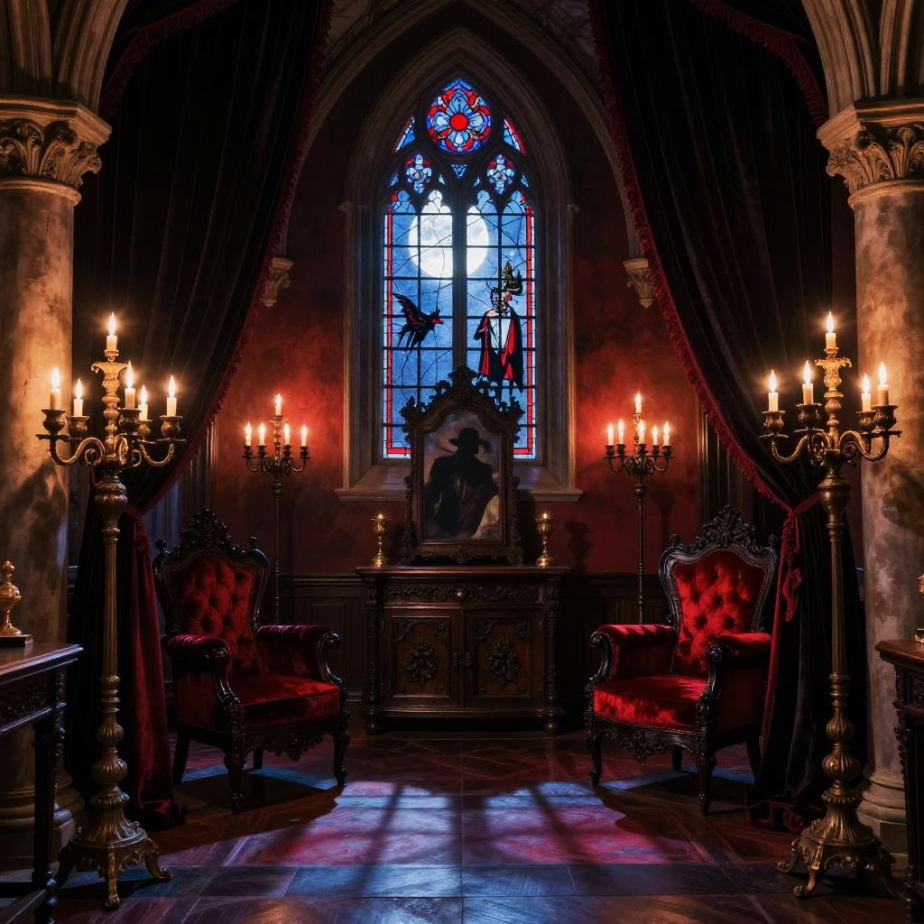 Vampire interior design featuring gothic architecture with dark velvet drapes, crimson and black color palette, ornate candelabras casting eerie shadows, antique wooden furniture with carved details, and a mysterious ambiance filled with moonlight filtering through stained glass windows.