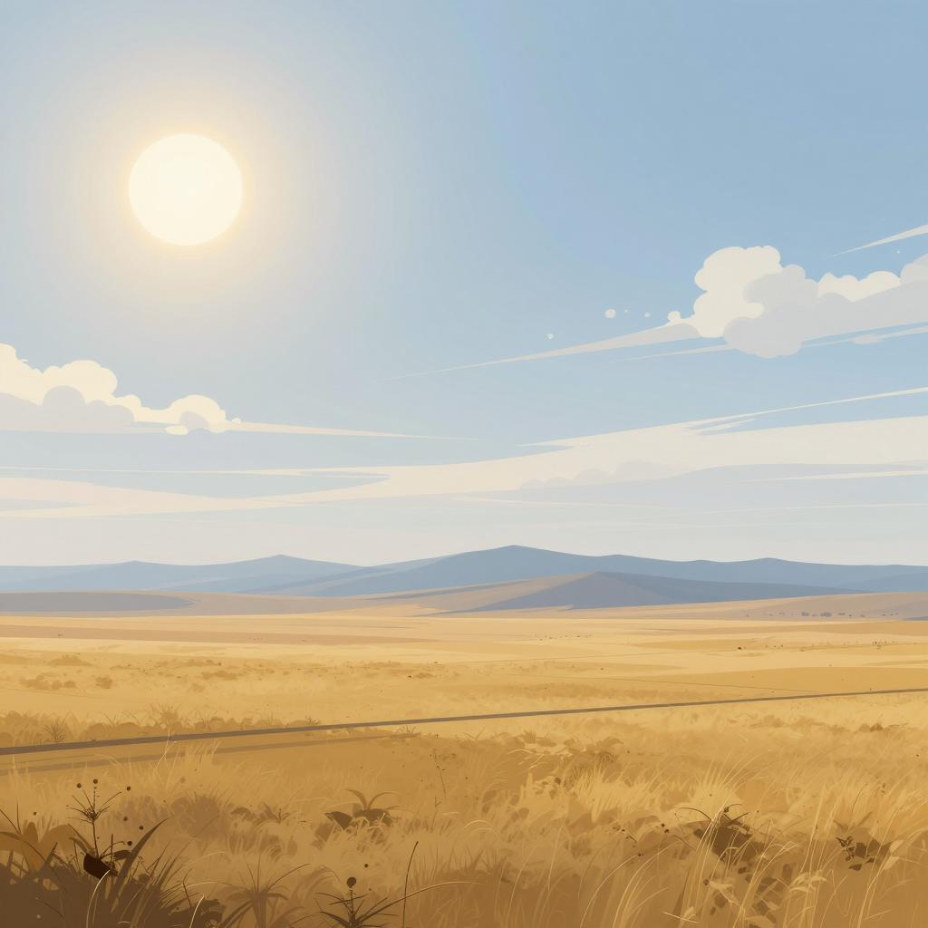 Digital abstract illustration of a vast golden savannah landscape featuring wide plains with parallel dark lines, under a bright midday sun. Distant blue mountains are visible on the horizon beneath a sky streaked with artistic light formations, evoking a poetic and intricate atmosphere.