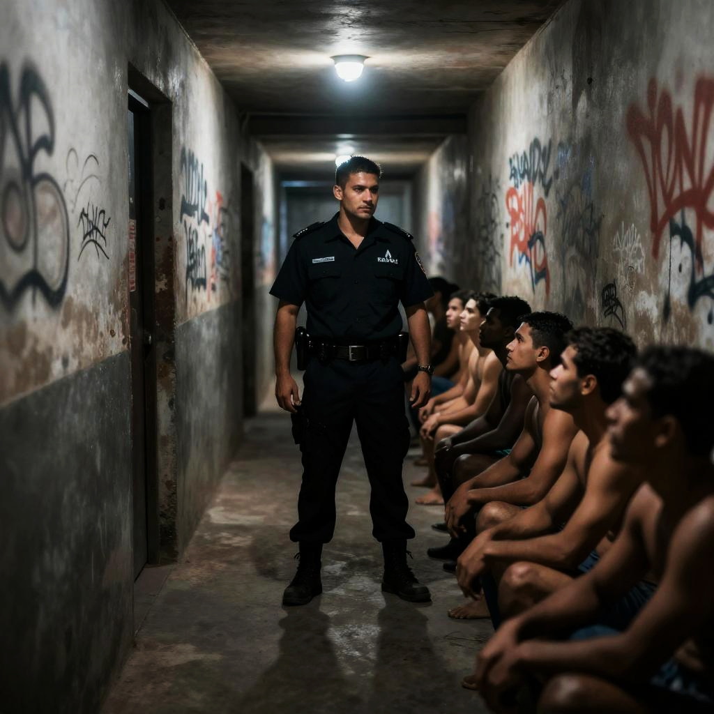 Photograph of a dimly lit corridor with graffiti-covered walls. A male security guard in a dark uniform stands in the center, facing a seated line of shirtless men on the right. The men have varied expressions, some looking up at the guard. The corridor has a single overhead light, casting shadows. The guard is slightly illuminated, while the men are in shadow. The corridor is narrow, with the men sitting closely together.