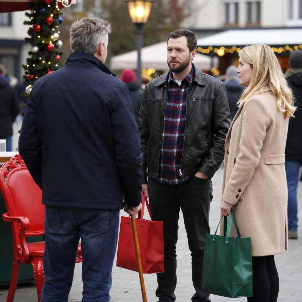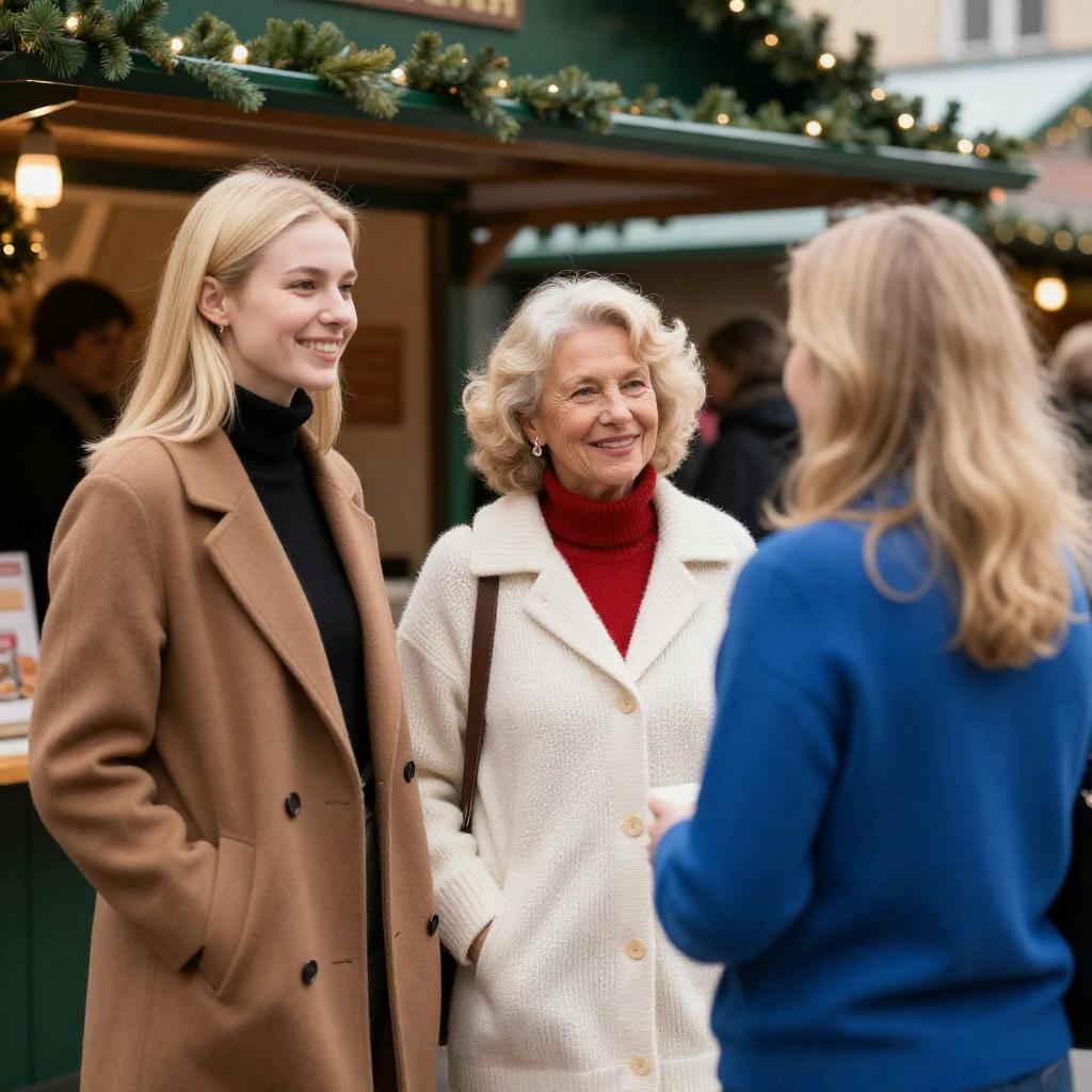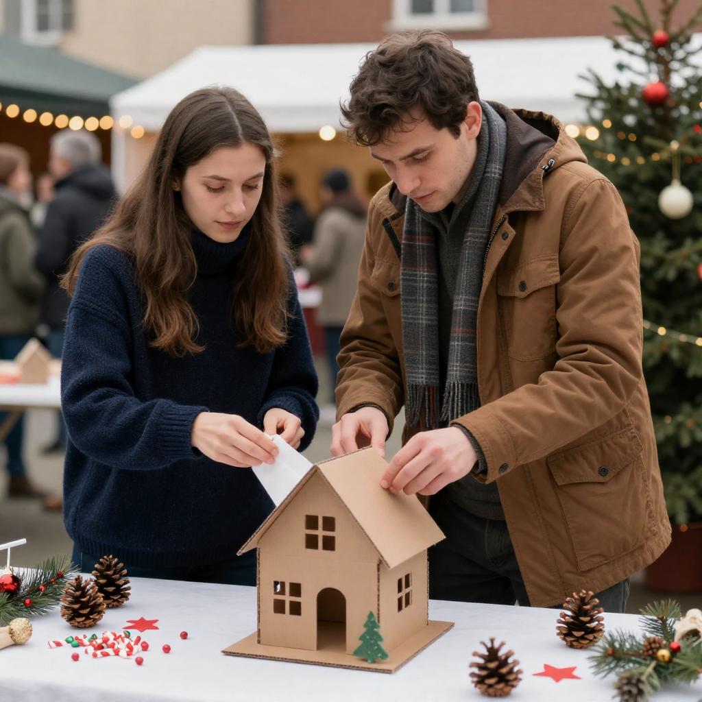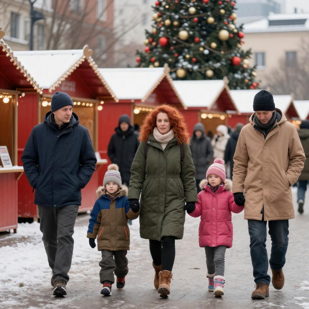 Photograph of a Christmas market. A man with a beard in a brown coat and gloves stands beside a woman with blonde hair in a blue and purple scarf, holding a red folder. A small brown and white dog sits on the grass in front. In the background, several people stand near decorated stalls with Christmas trees. A large sign reads "Gorgi Christmas Fair." The scene is outdoors with green grass and trees, and a castle is visible in the distance.