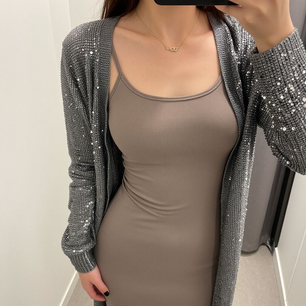 Selfie taken by a woman showcasing a stylish ensemble featuring a taupe bodycon dress paired with a shimmering, sparkly cardigan adorned with numerous small, reflective embellishments, complemented by a delicate gold necklace and black nail polish.