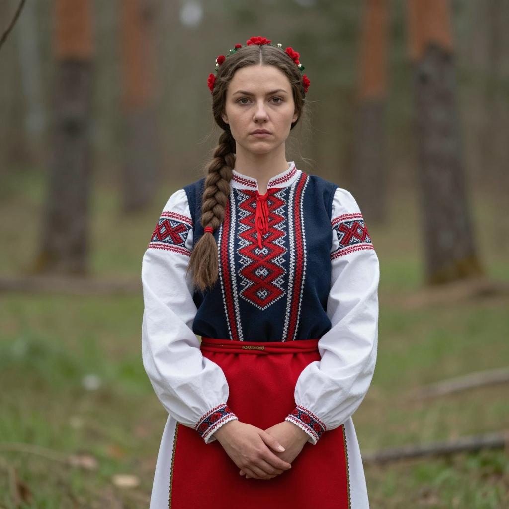 Photorealistic portrait of a young woman wearing a traditional Subli folk dance costume. She has long braided dark hair adorned with a colorful flower crown and wears a detailed embroidered blouse with vibrant floral patterns. She also wears a gold necklace and has brown eyes with a neutral expression. The background shows an outdoor market with blurred people and warm lighting, creating a bokeh effect.