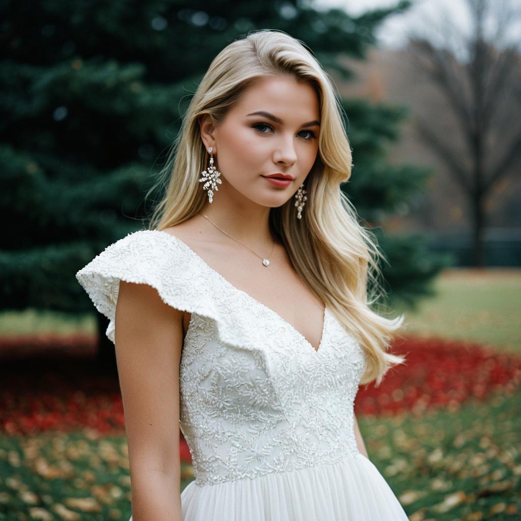 Winter wedding attire,1girl, solo, dress, brown hair, tree, jewelry, earrings, long hair, white dress, blurry background, outdoors, blurry, brown eyes, see-through