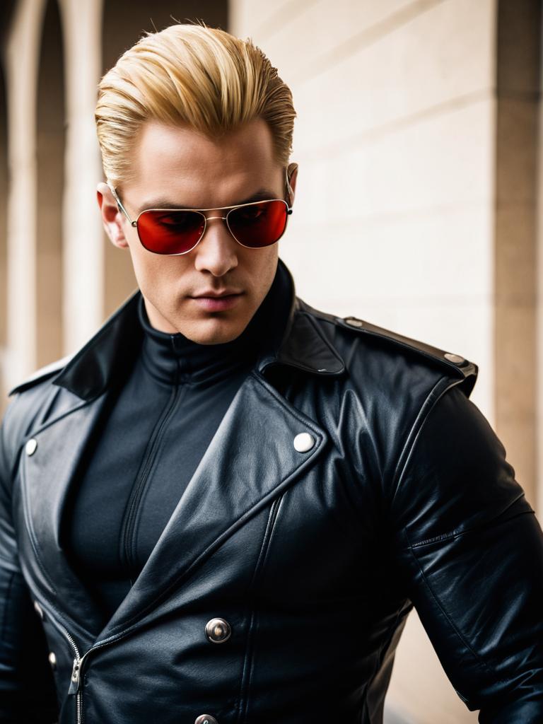 Photo-realistic cosplay portrait of a muscular blonde man with slicked-back short hair, wearing a black leather jacket and red-tinted sunglasses. The image features natural warm lighting and soft background blur, highlighting detailed textures of the costume.