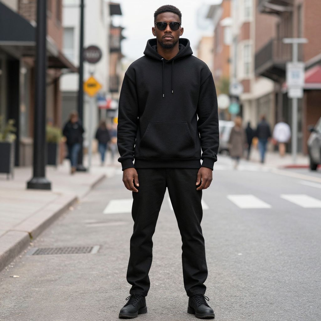 Photograph of a Black man standing confidently in a city street, wearing a black hooded sweatshirt, black pants, and sunglasses. Urban background with