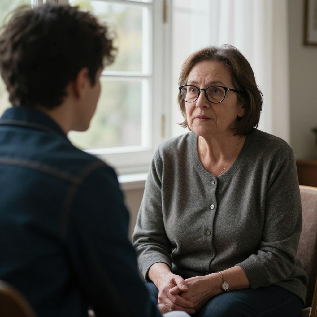 Two individuals engage in a heartfelt conversation, with an older woman wearing glasses and a younger person facing her, both seated indoors near a window with soft natural light filtering through.