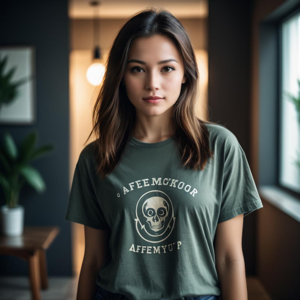 A portrait of a young woman with afé and natural makeup, wearing a casual t-shirt, standing in an indoor setting with soft moody lighting and deep shadows, realistic photography style with cool and muted colors, soft focus and cinematic atmosphere
