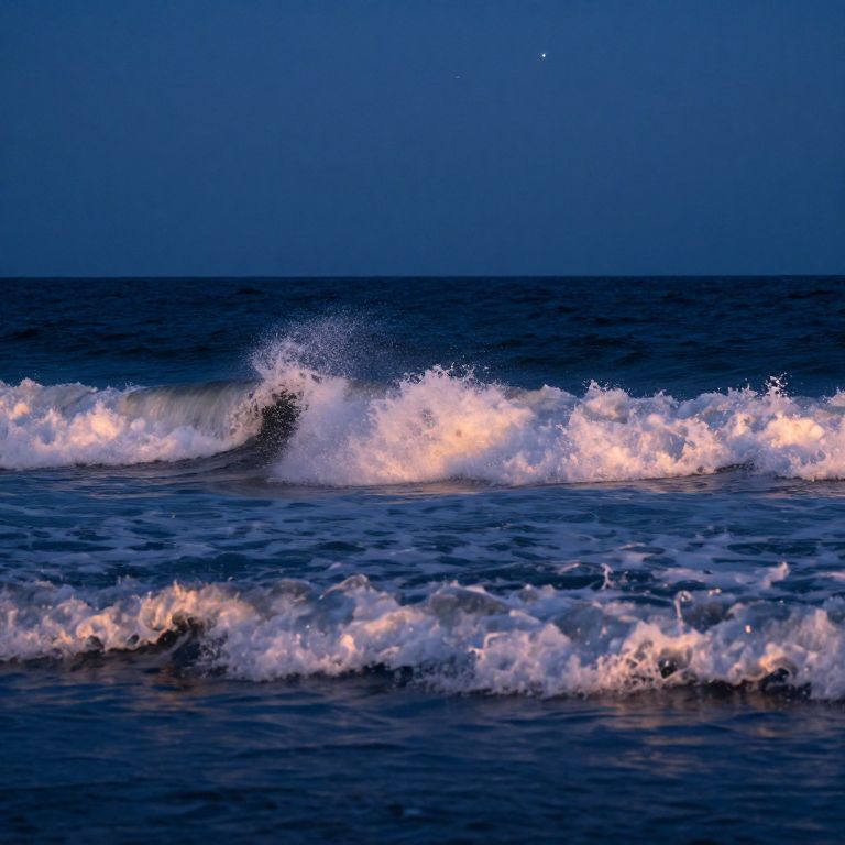 Waves crest and crash under a starlit sky, their frothy peaks catching the ethereal glow of distant stars as they cascade into the deep blue expanse of the ocean.