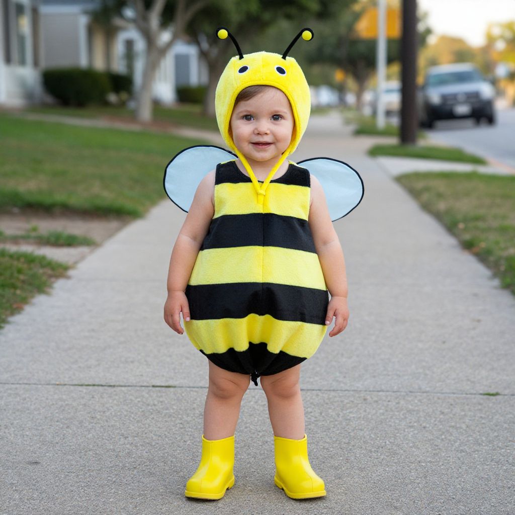 Photograph of a smiling toddler in a yellow and black bee costume with wings and yellow boots, standing on a suburban sidewalk.