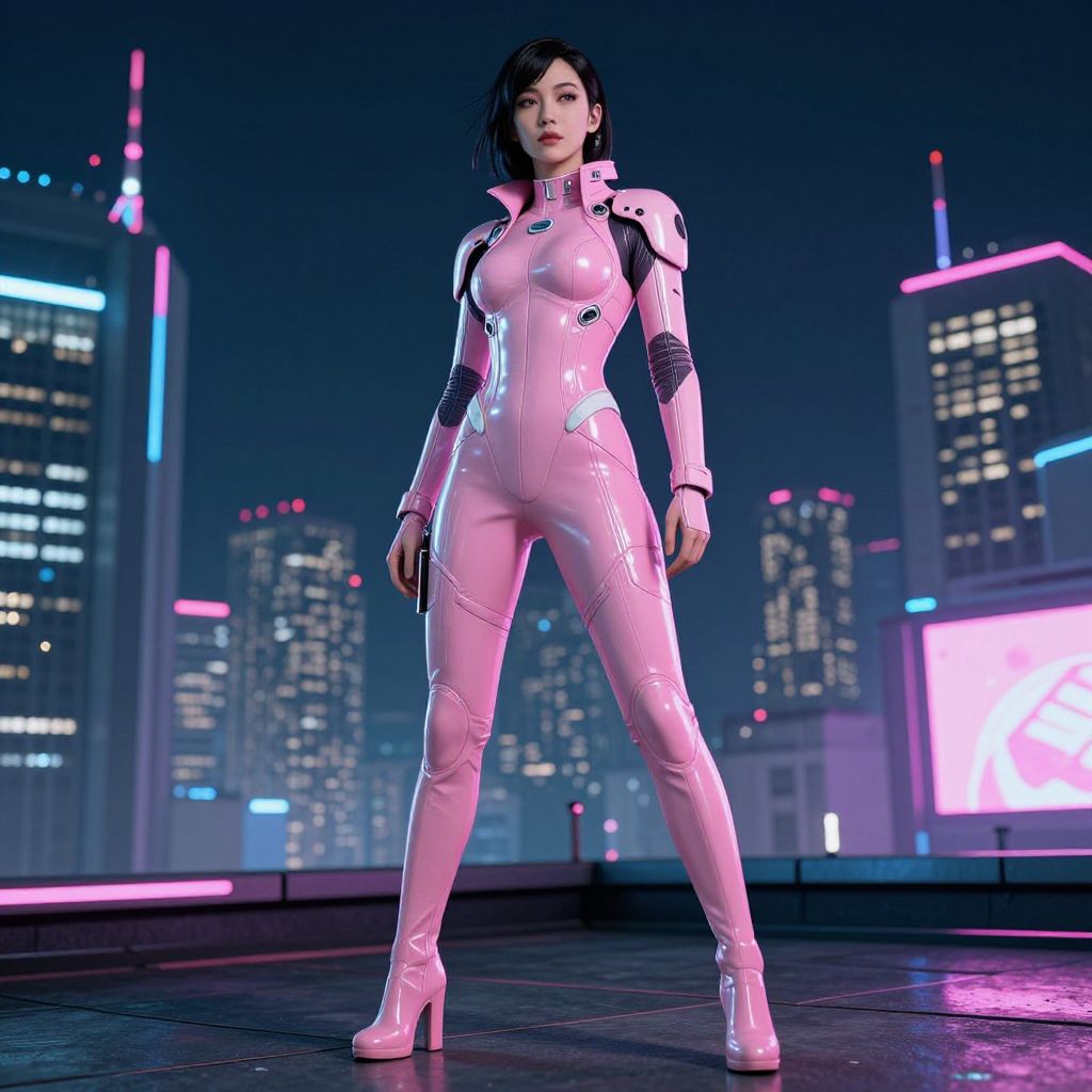 A futuristic woman wearing a sleek pink spandex suit standing confidently on a neon-lit city rooftop at night, cyberpunk style, glowing cityscape in the background, reflective materials, high contrast lighting, dynamic pose