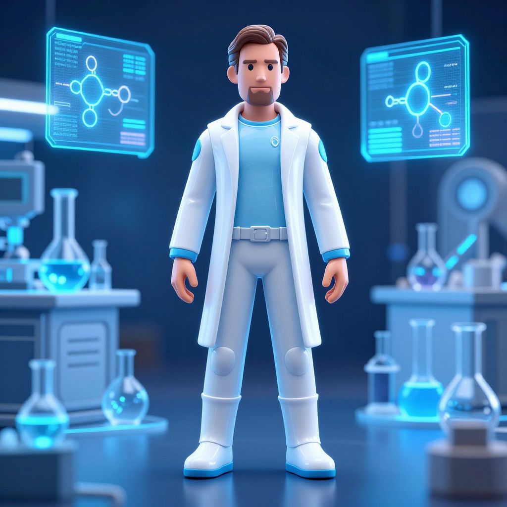 3D CGI image of a bearded man in a white lab coat, blue and white attire, standing in a futuristic lab with glowing blue molecular diagrams