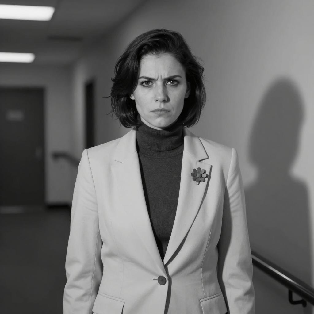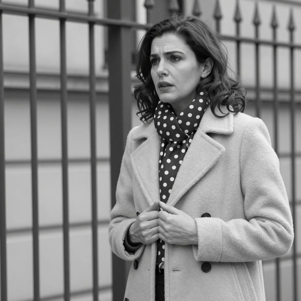 Black-and-white photograph of a woman with wavy dark hair, wearing a light-colored double-breasted coat and polka-dotted scarf, standing in front of vertical metal bars. She has a slightly surprised or concerned expression, hands clenched at her coat's front. Background includes blurred building structure. She is positioned to the right, facing left.