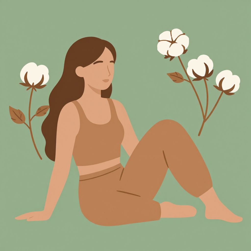Digital illustration of a woman with brown hair, wearing a sleeveless, brown, form-fitting dress, reclining on a light green background. She has a calm expression and is surrounded by four white cotton flowers with brown stems, two on the left and one on each side of her. The style is minimalist with flat colors and simple shapes, emphasizing a serene, natural aesthetic. The woman's pose is relaxed, with one arm supporting her upper body and legs slightly bent.