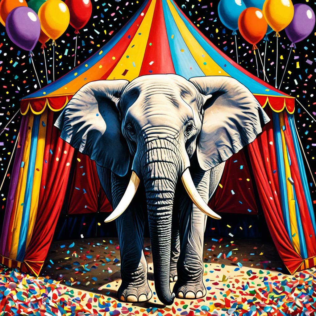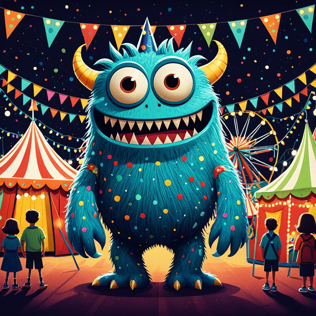 Illustration of a large, friendly blue monster with yellow horns and multicolored polka dots standing in the center of a vibrant carnival scene. The carnival features bright striped tents, festive string lights, colorful flags, and a Ferris wheel in the background. Four children stand at the edges, looking at the monster. The art style is joyful, animated, and influenced by Mary Blair and Pixar.