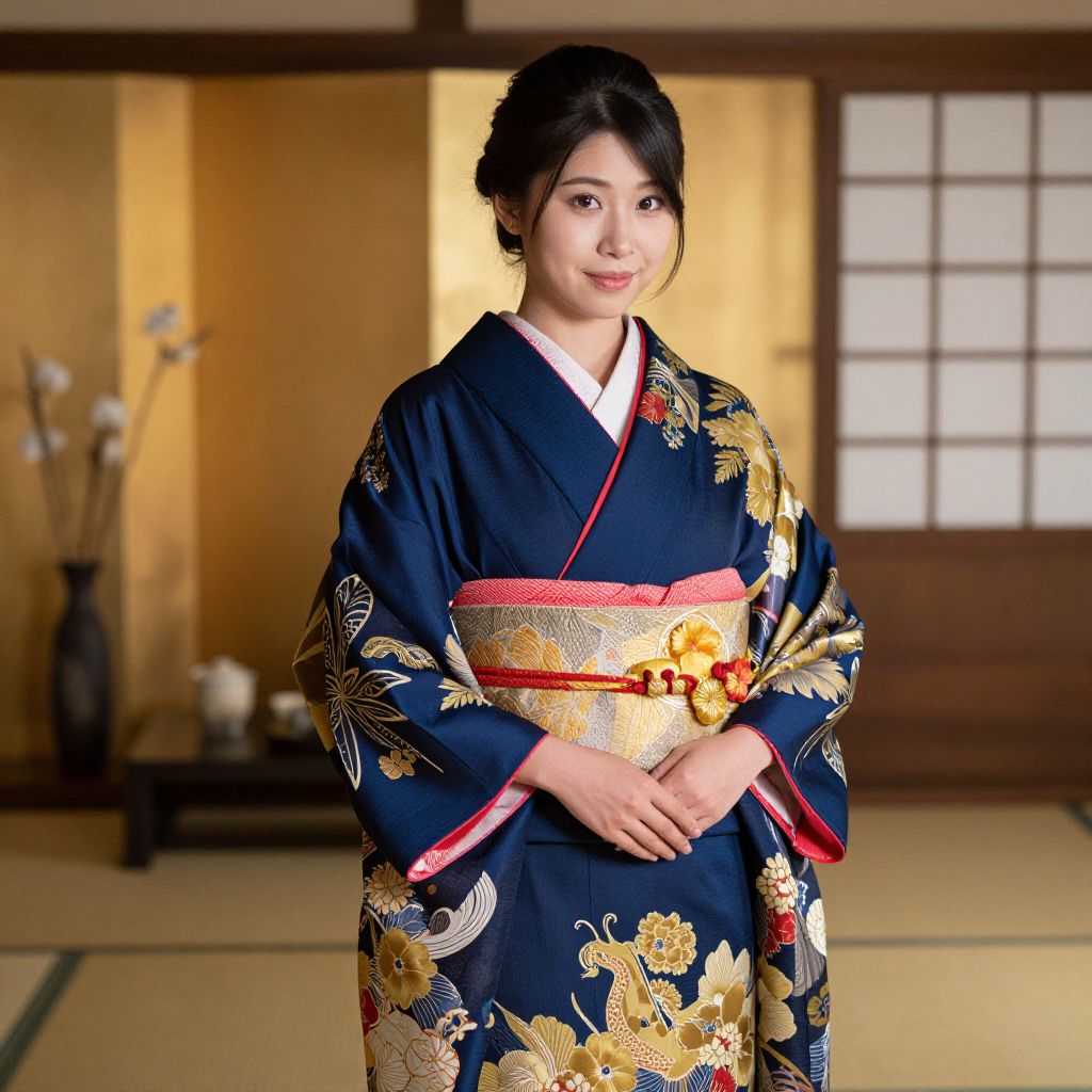 Traditional Clothes Asia, woman in a blue and gold kimono