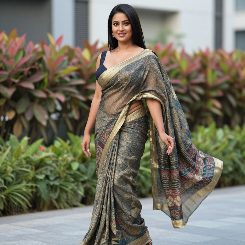 Confident Woman in Patterned Saree Gown