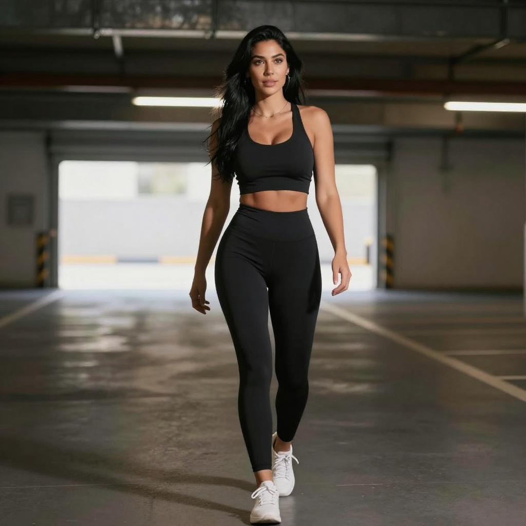 Photograph of a fit woman with long black hair, wearing a black crop top and high-waisted black leggings, walking in a dimly lit underground parking garage. She has white sneakers and a confident expression, with bright light from the garage entrance behind her.
