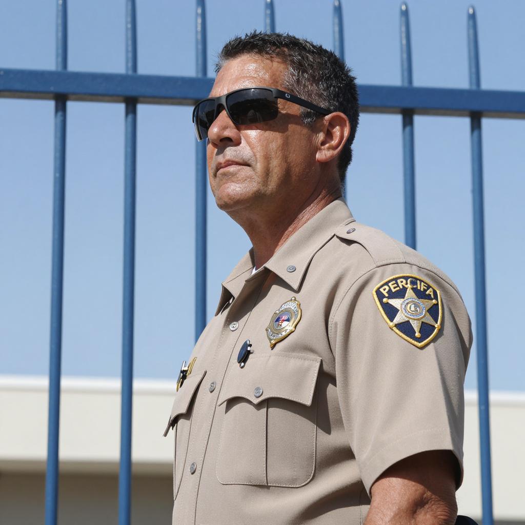 Photograph of a middle-aged man with short, dark, slicked-back hair, wearing a tan shirt with a sheriff's badge, looking to the side with a serious expression. Background: group of people, beach setting, sand dunes. Man in foreground, 6 people in background, wearing casual summer clothes. Bright daylight.