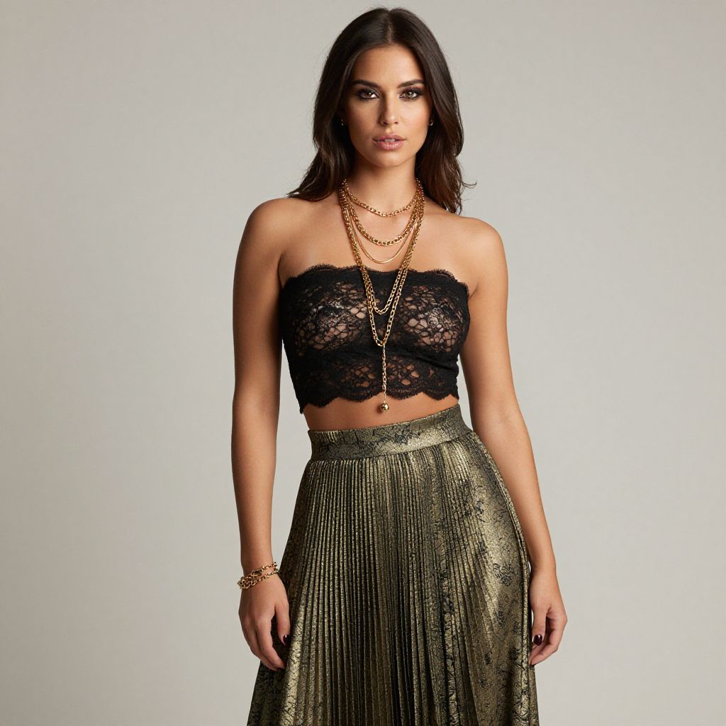 Photograph of a young woman with long, dark brown hair and light olive skin, standing against a plain white background. She wears a black lace strapless crop top that reveals her midriff, paired with a high-waisted, gold, pleated skirt that shimmers under the light. She accessorizes with multiple gold necklaces and a matching bracelet. Her makeup is subtle, highlighting her dark, defined eyebrows and full lips. The image has a high fashion, editorial style, emphasizing her confident, poised stance and elegant attire.