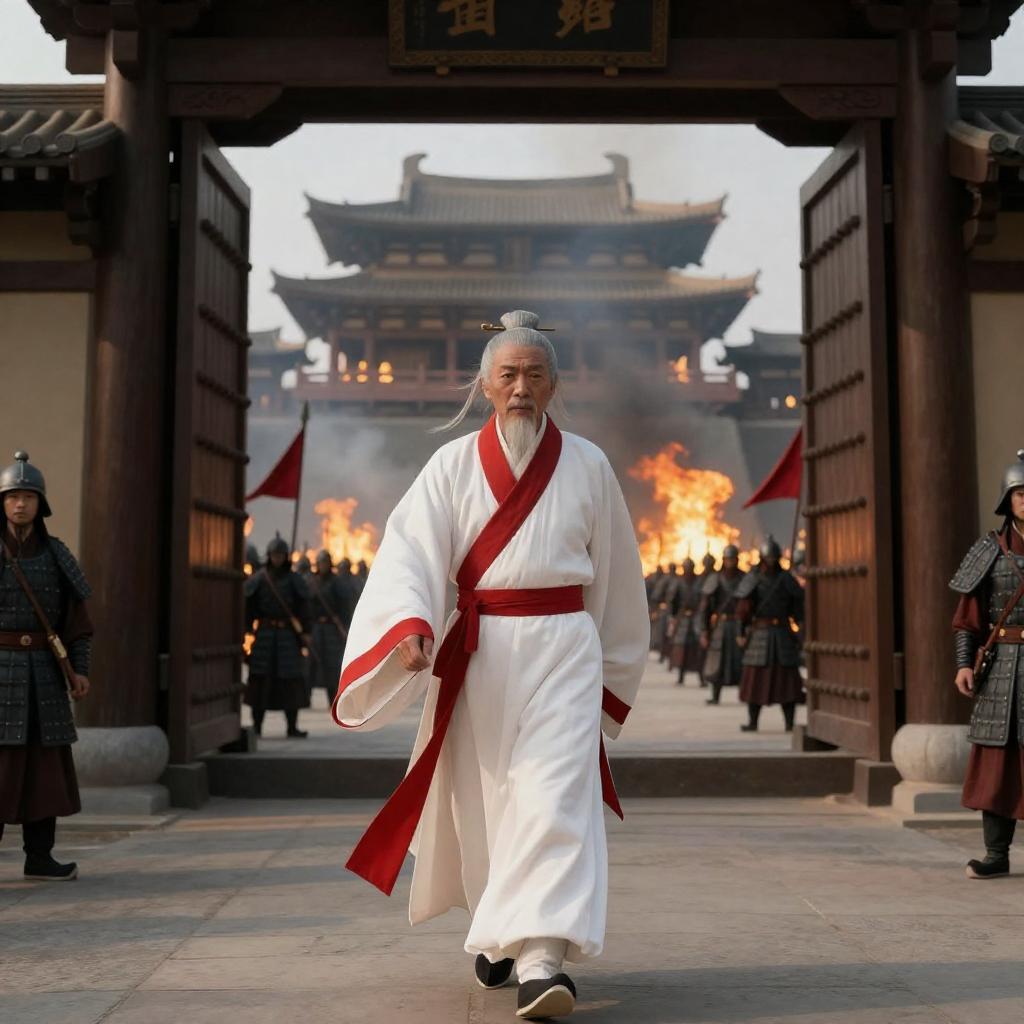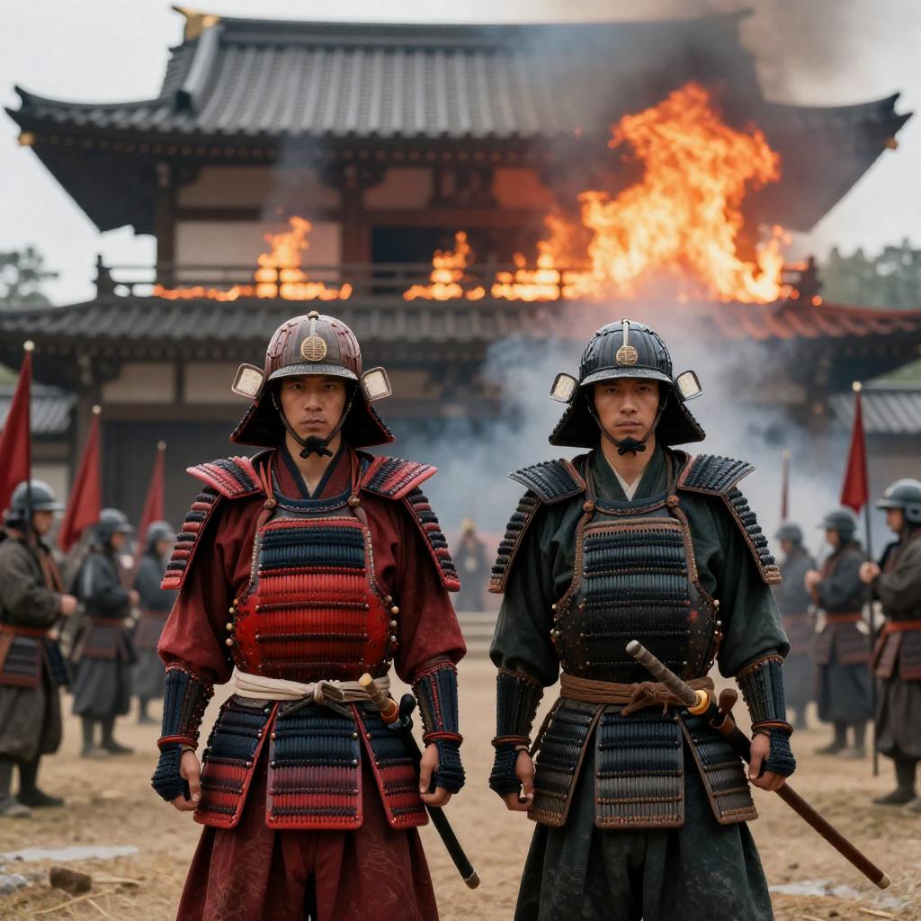 An intense martial artist dressed in black traditional clothing crouches on a wooden platform holding a raised sword. He is surrounded by five men wearing brown robes and straw hats, standing in a misty bamboo forest with sunbeams filtering through the trees. The scene evokes a traditional Asian setting with an epic and dramatic atmosphere.