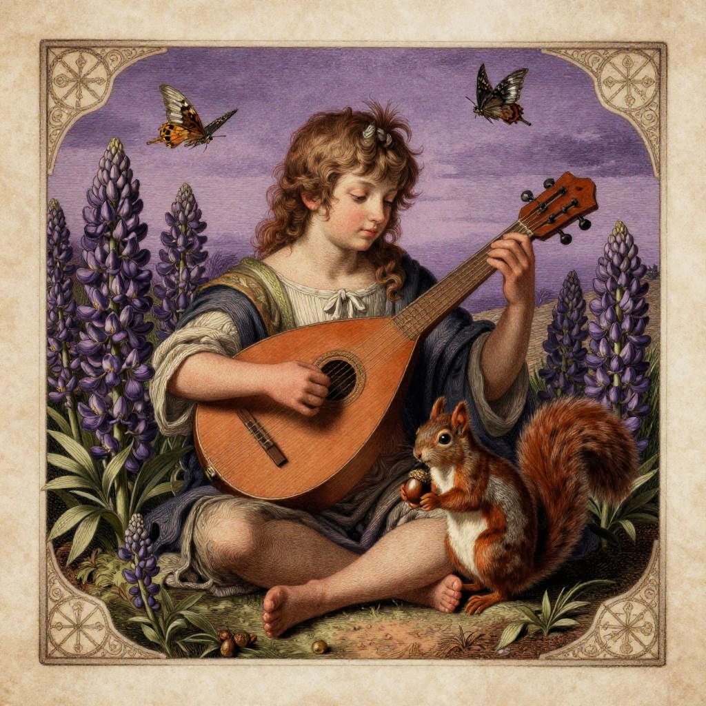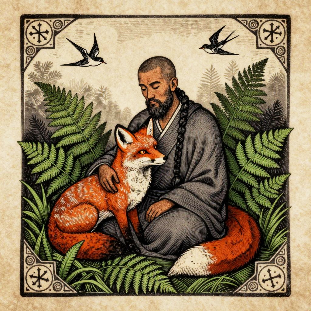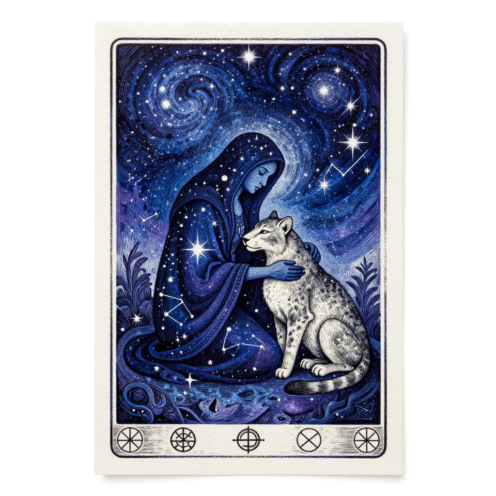 Celestial block print, a ethereal priestess with moon crown seated amid blooming night jasmines, embracing a silver-scaled koi resting below; luminous indigo sky with sparkling constellations; delicate stippling and gentle gradients; soft lavender and pale gold palette; smooth rice paper, celestial motif border and starry glyphs; centered composition, expansive negative space; ultra detailed linework, subtle pearl ink flecks, soft vignette, hand-engraved look, mystical aura, archival print quality, finish