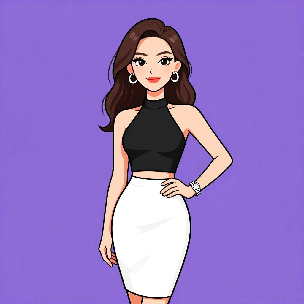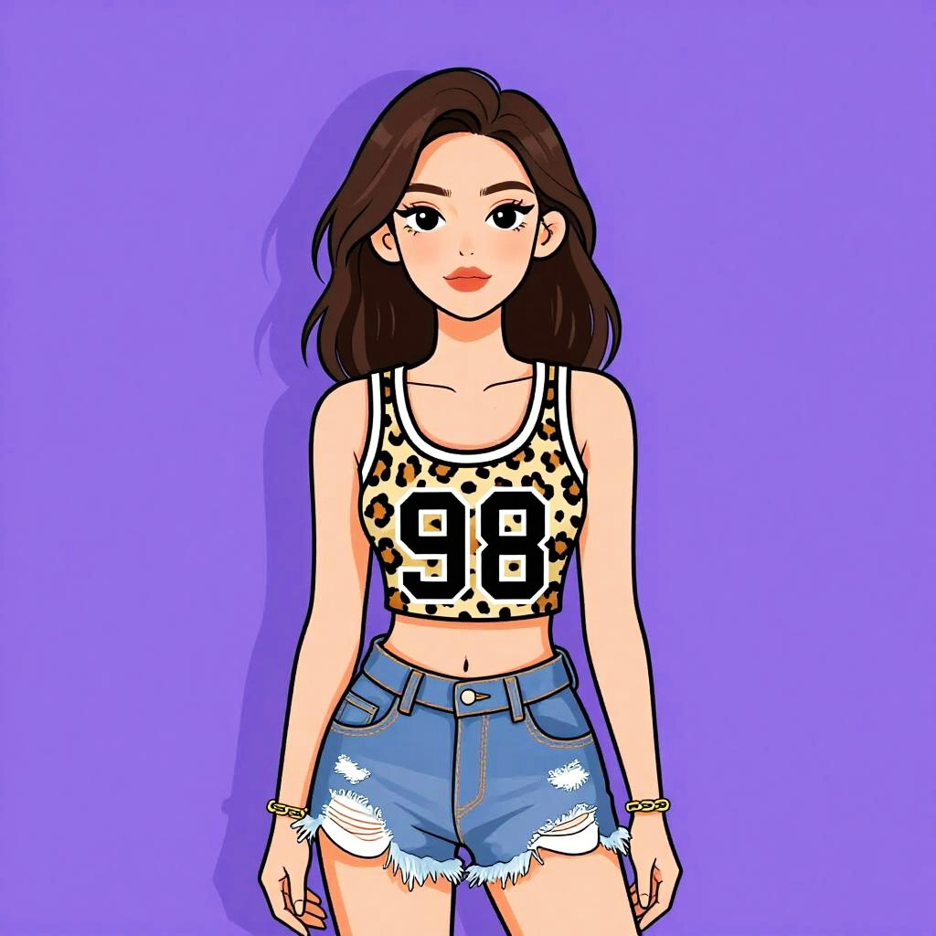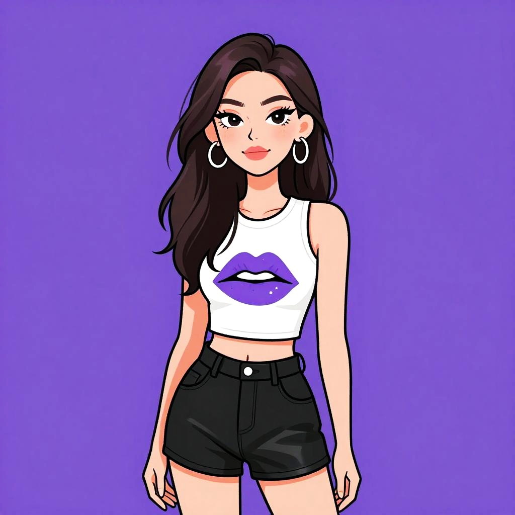 Woman with pretty face and pretty hair. Woman, casual, sleeveless white graphic tank top with lips print, black faux leather shorts, relaxed fit. --sref 1467
