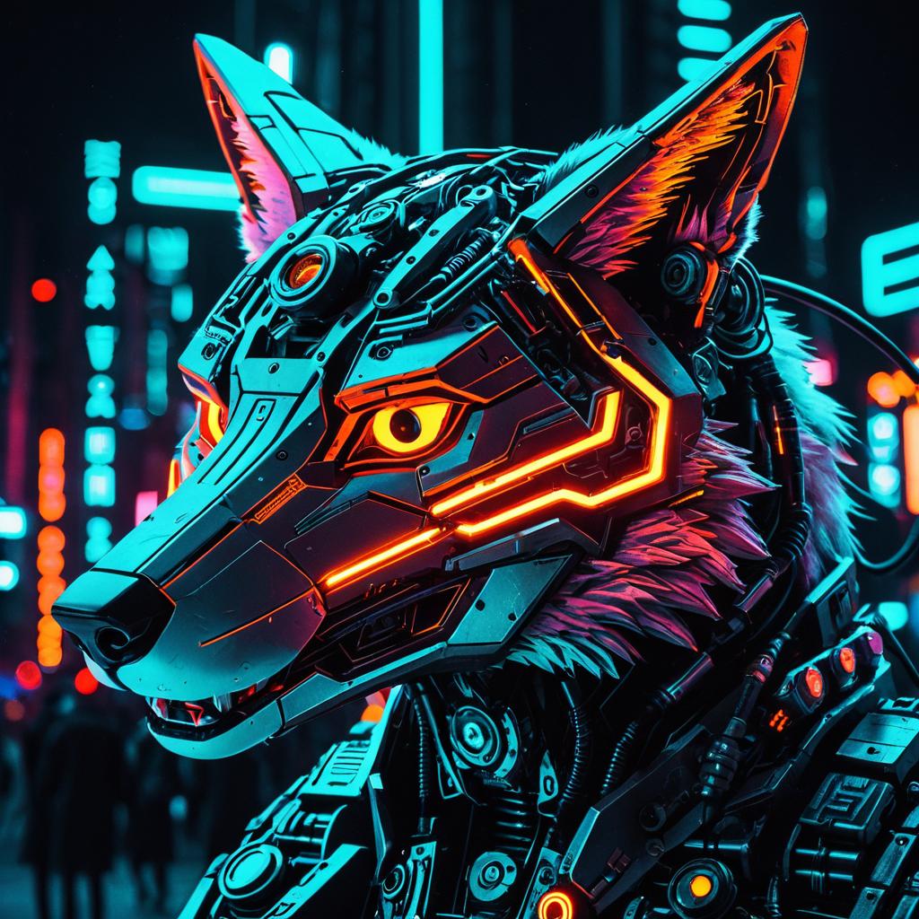 Cyberpunk style, neon-lit mechanical fox, futuristic, technological, neon nights, advanced civilizations, intricate details, glowing components
