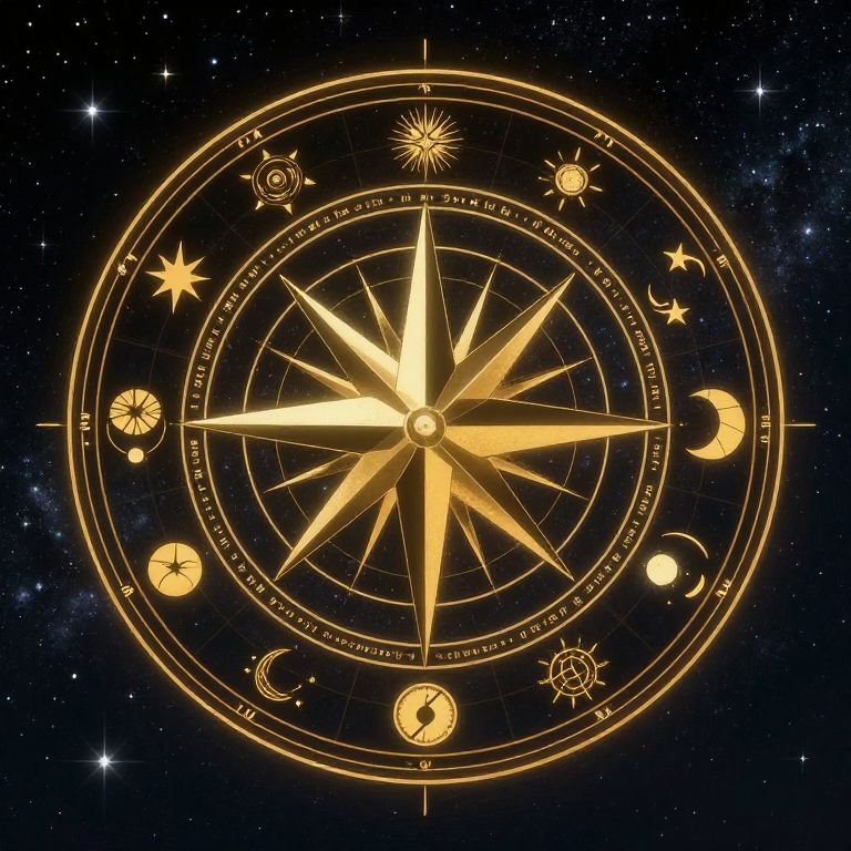Starlit compass radiates golden tones, encircling twelve celestial symbols in concentric orbits, each marked by unique glyphs and phases, forming a cosmic map of harmonic resonance against a star-studded night sky.