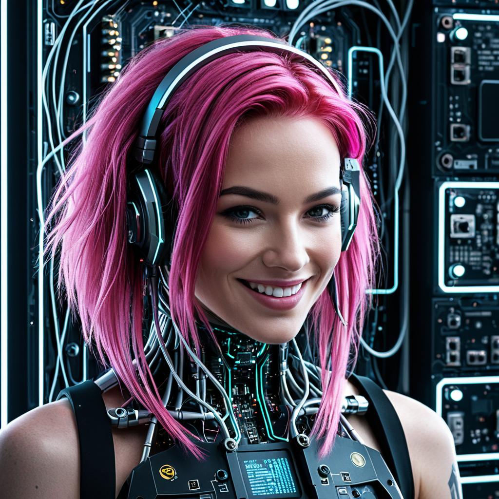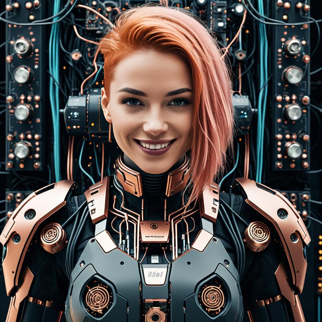 Hyperrealistic portrait of a smiling female cyborg with rose gold armor plating and exposed electronic circuitry. The subject has asymmetrical rose gold hair and wears advanced sci-fi mechanical suit components with intricate wire management, set against a futuristic background filled with complex wiring and electronic panels.