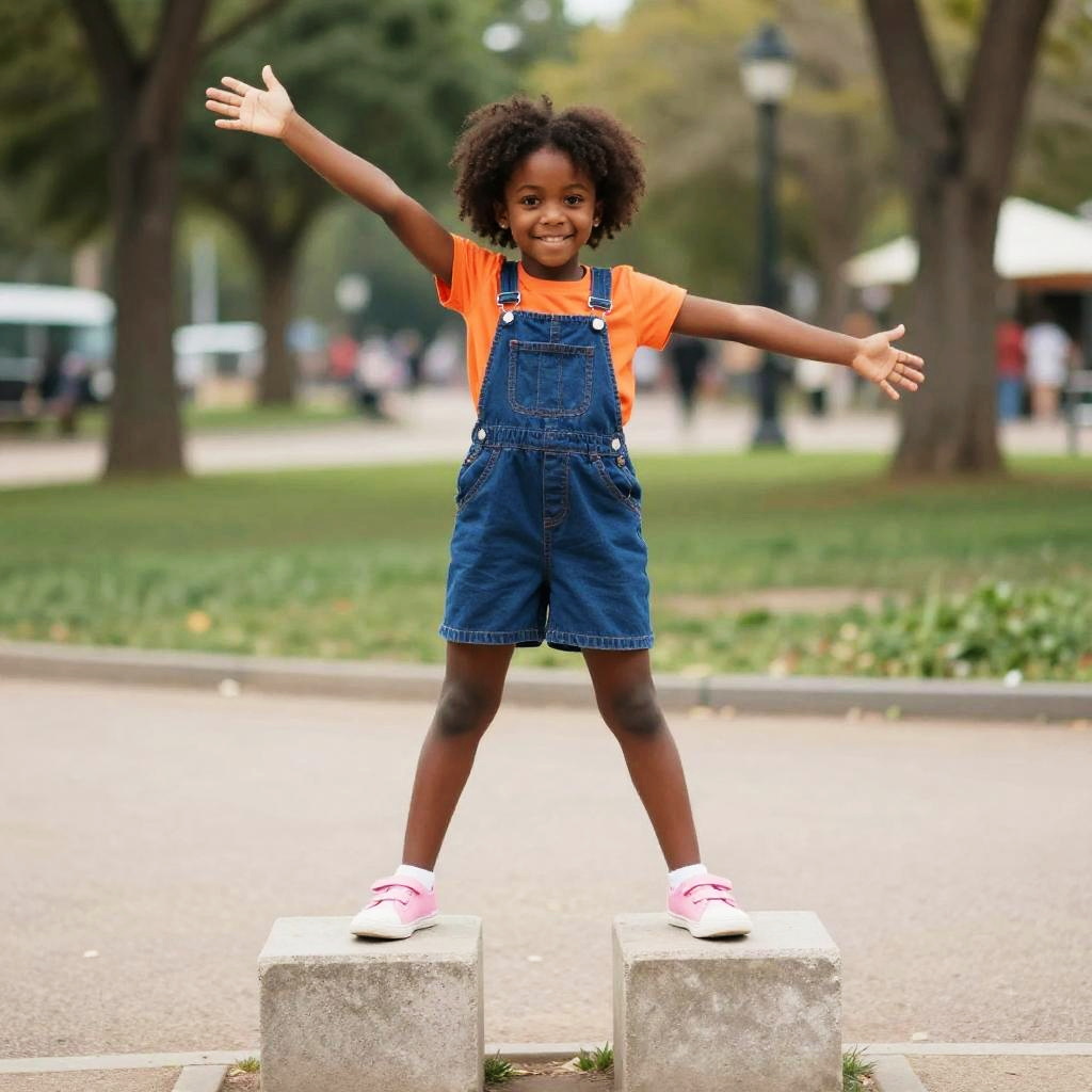 A photograph of a smiling young Black girl standing on two small concrete blocks in a park. She has short curly hair, wears a blue overall dress with orange sleeves, and pink shoes. Her arms are outstretched in a playful pose. The background features a blurry park setting with trees, grass, and a paved path. The lighting is natural, giving a bright, sunny feel.