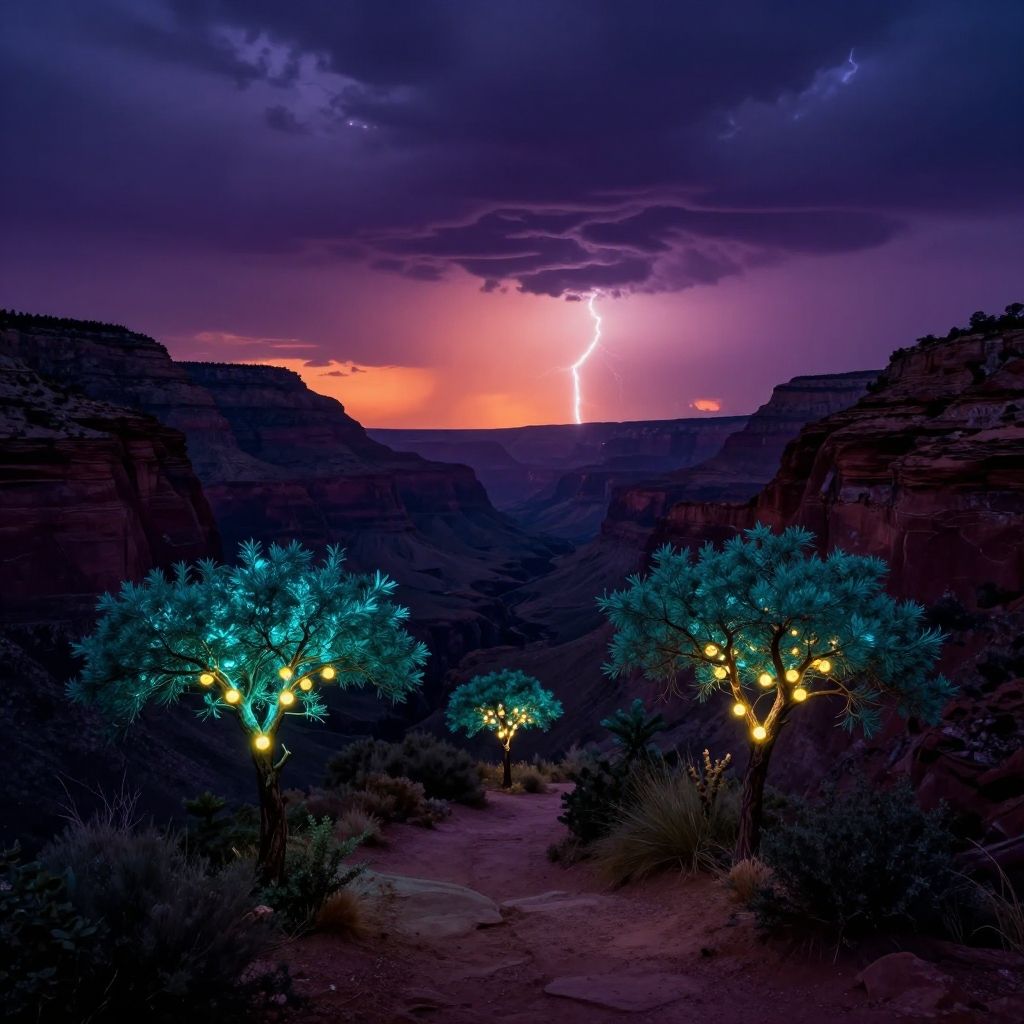 A mesmerizing sunset, canyon, small trees, footpath, bush, thunder, lit by glowing fruit on magical treeseverything looks perfect, good vibes, positivity, most beautiful picture in the world, <8k, high detail, uhd, sharp focus, palette, photorealistic, absurdres, extreme detail, as much detail as possible, extremely high visibility>, matte indigo, shiny teal