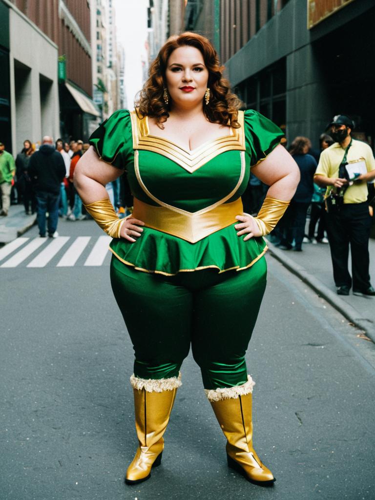 Plus Size Celebrity Costume, dressed in a green and gold costume standing on a street
