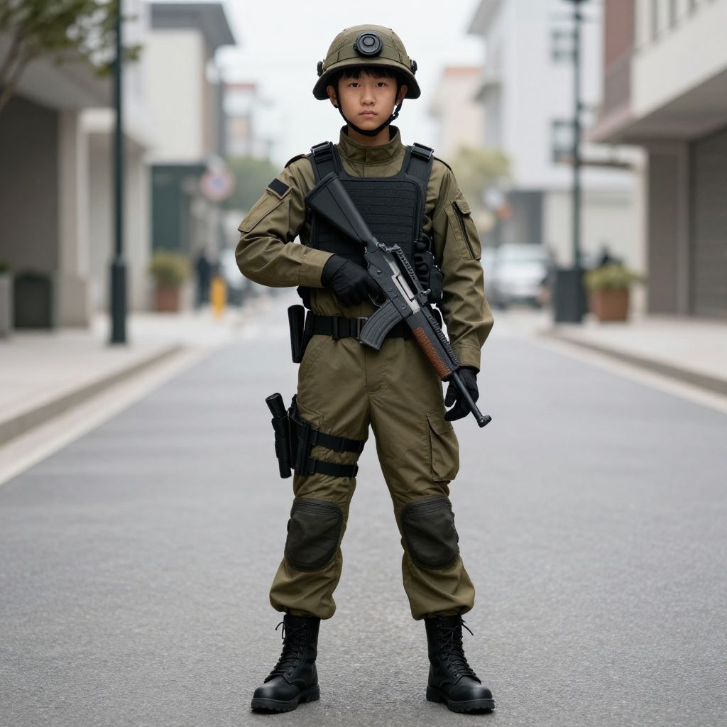 Modern Combat Soldier Boy Costume, soldier in uniform standing on the street with a gun