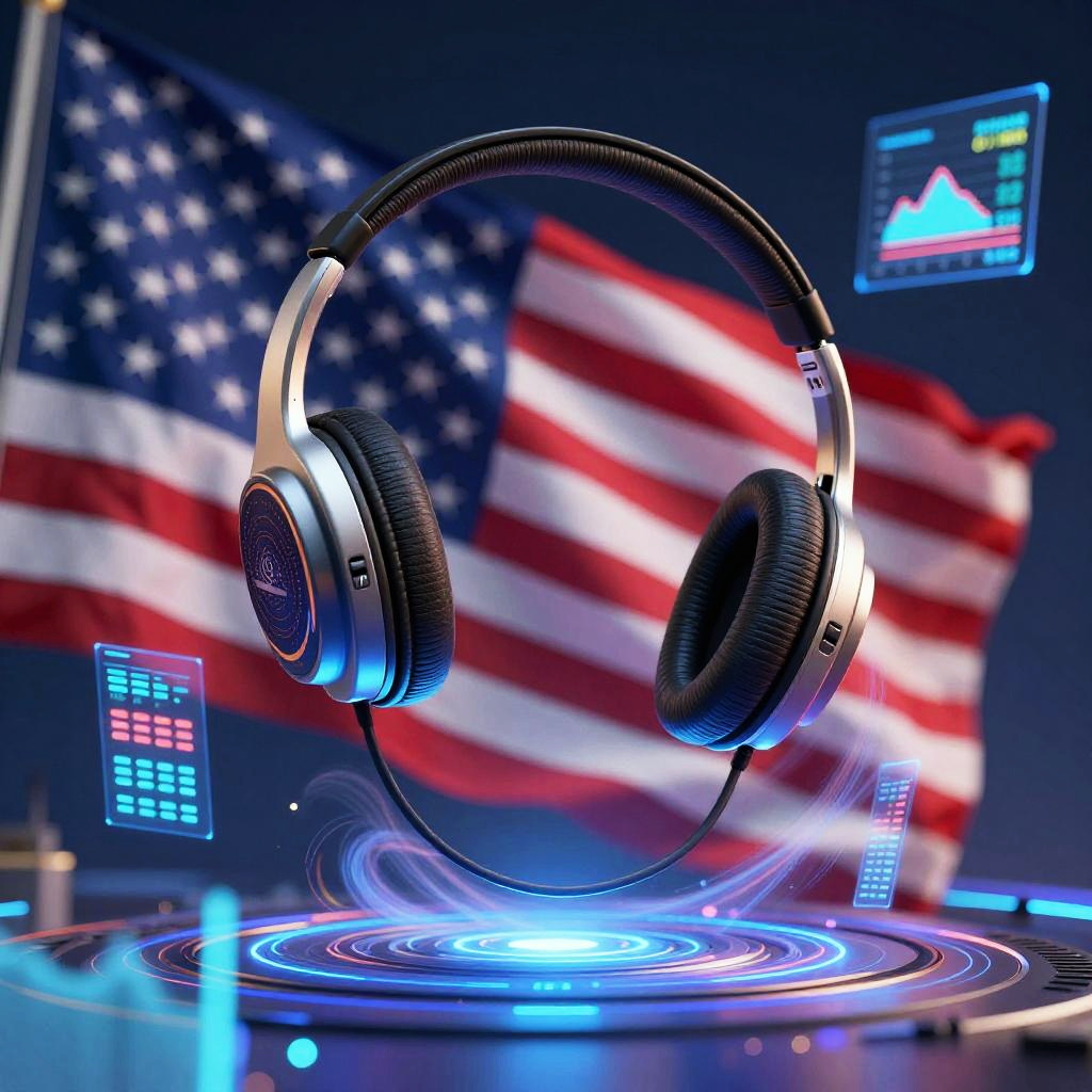 A modern headset floating above a digital platform with swirling data streams and holographic graphs. The background features a blurred American flag, blending political symbolism with futuristic technology. The image combines vibrant colors and sharp contrasts in a science fiction inspired art style.