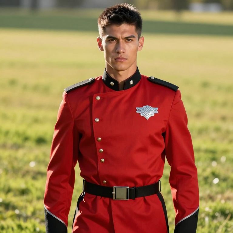 A tall, athletic male with sharp facial features and a calm, focused expression wears a red and black uniform with a bold silver patch on the chest. The uniform is well-fitted, with a high collar and epaulettes, giving it a military-inspired appearance. He stands confidently in a sunlit field, the red and black colors standing out against the green grass and golden sunlight, conveying strength and authority.