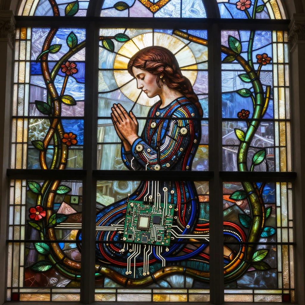 Prayer for technology, an intricate stained glass window depicting a divine network of wires and circuit boards intertwined with natural motifs like vines and flowers, illuminated by sunlight, symbolizing the sacredness of technological advancement.