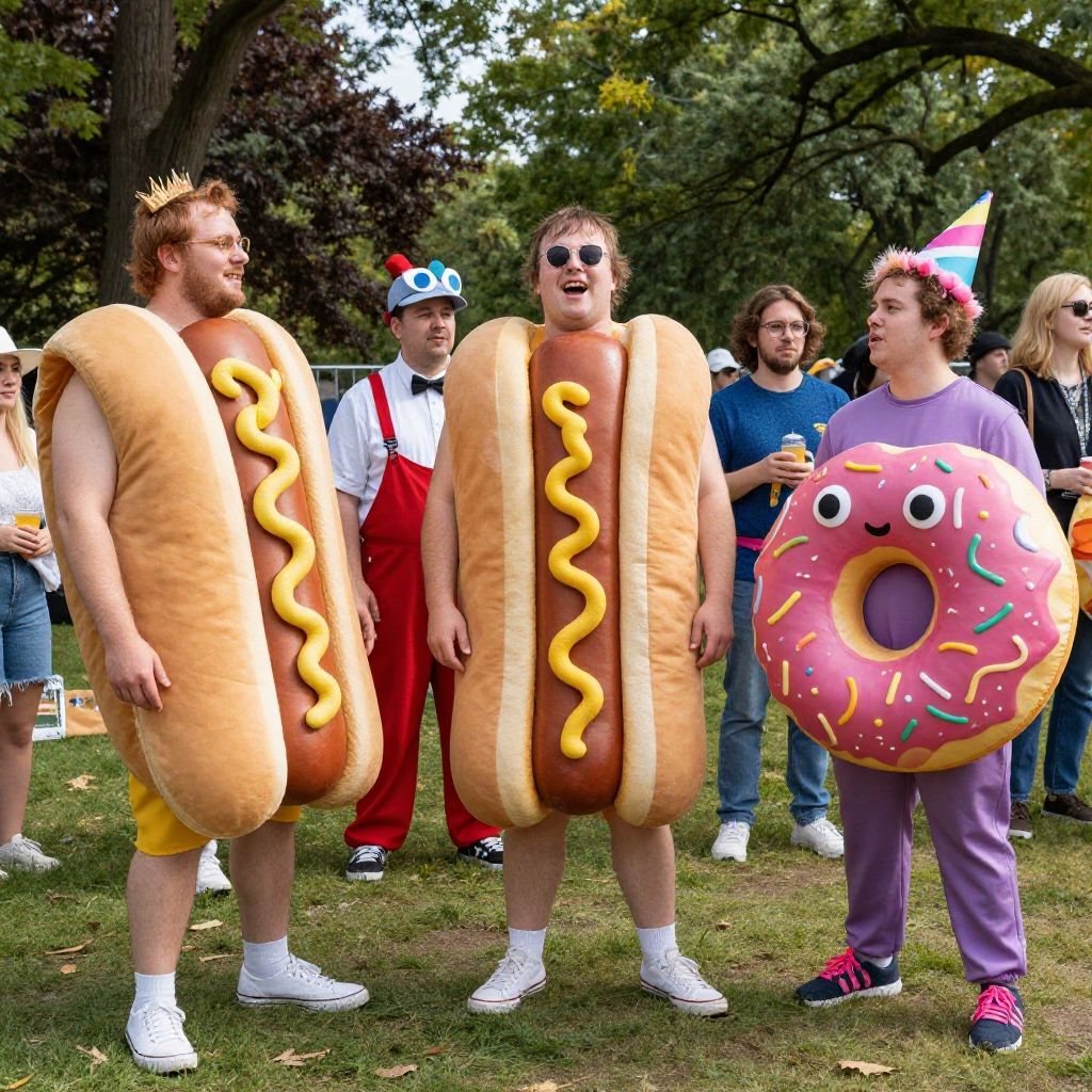 A group of friends wearing funny costumes for fat guys such as giant hotdog and donut suits, set in a sunny park during a costume contest, vibrant colors and exaggerated features emphasizing the playful, joyful nature of the event.