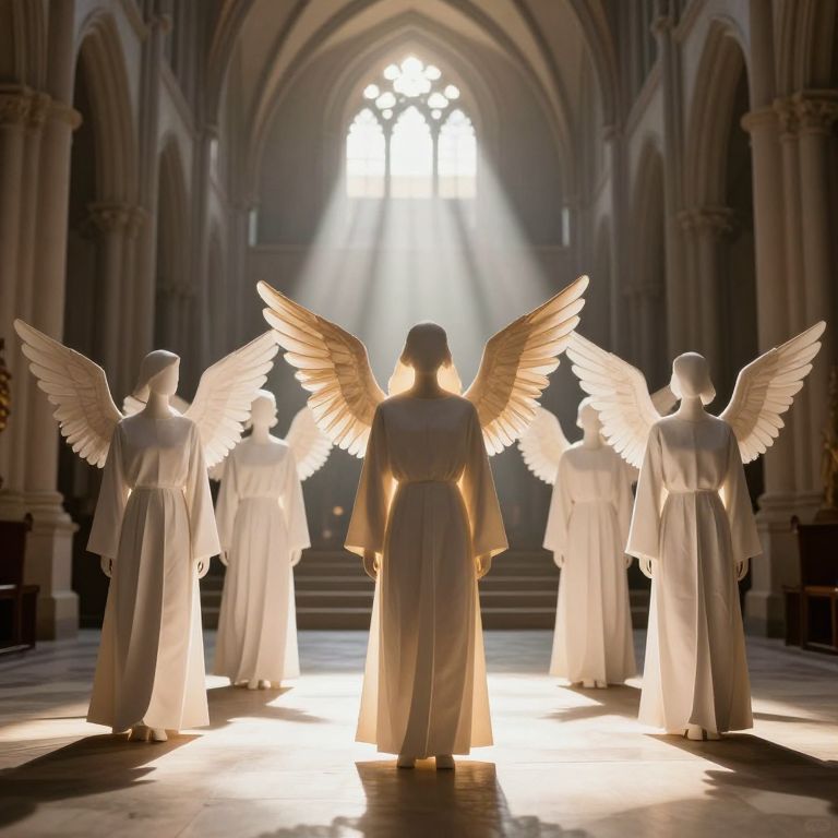 Photograph of a serene, ethereal scene in a Gothic cathedral; six white-robed angelic figures with wings surround a central figure with large wings