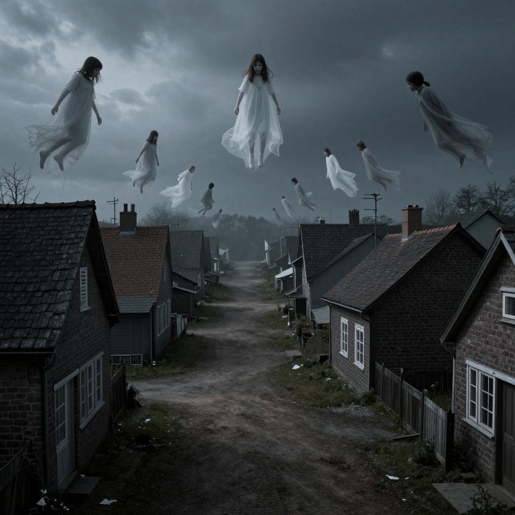 Stunning 35mm empty town by ejsing, jesper. full of ghostly children floating above the houses, photography, surrealism, dark, fantasy, digital art, crewdson, gregory