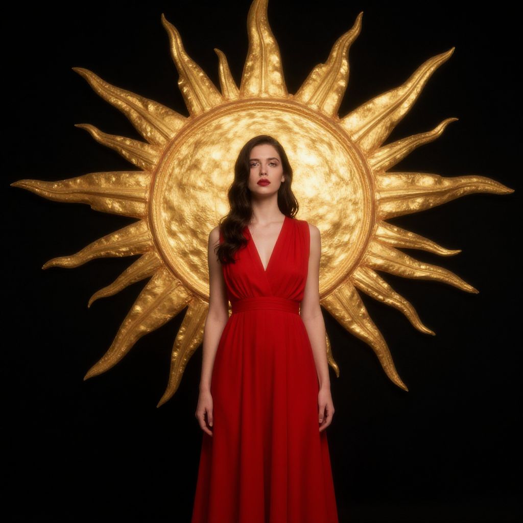 "Woman From God, a woman in a red dress standing in front of a gold sun"