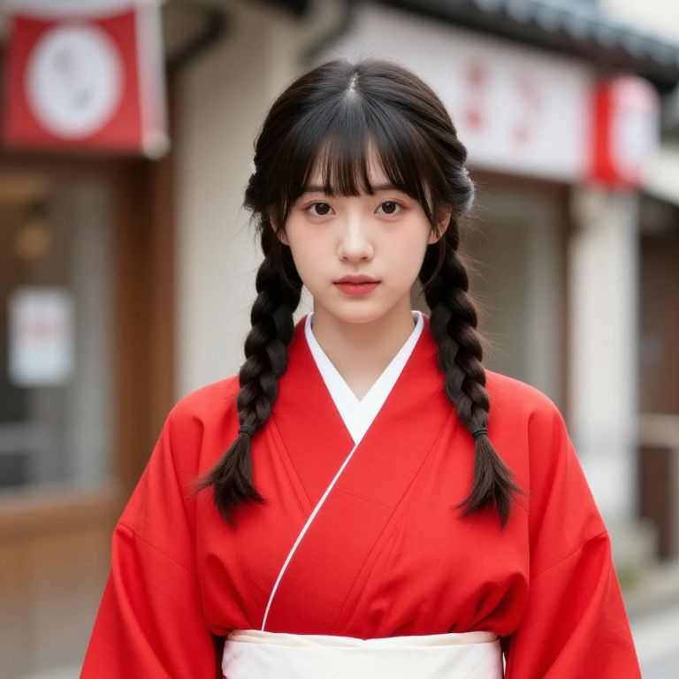 Asian girl with braids in her hair wearing a red kimono with a white collar and a red stripe down the center. She is standing in front of a building with a red and white sign on it.